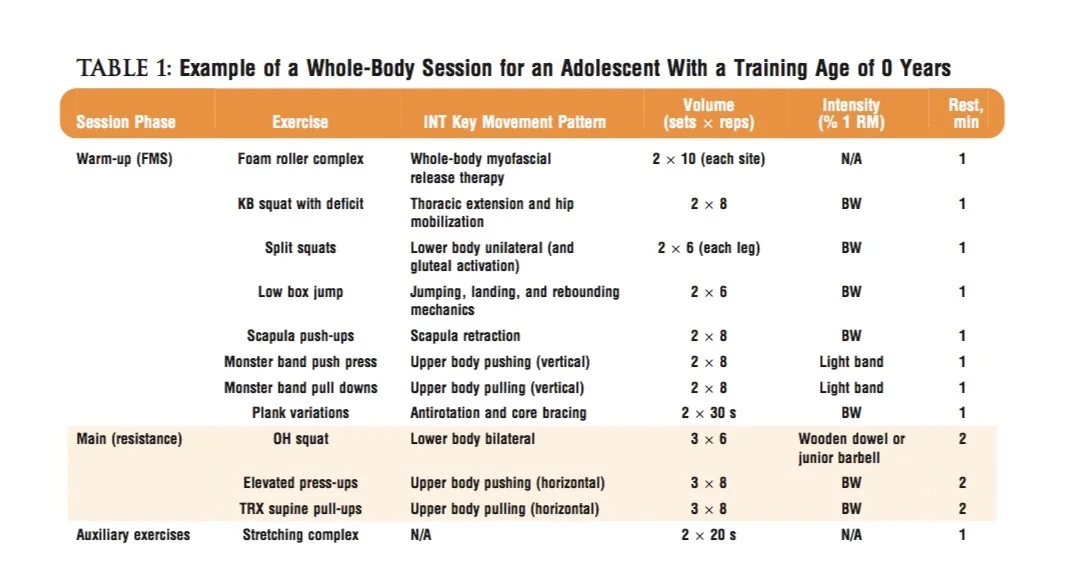 This is an example of a resistance training programme for an Adolescent (Age 12-18 for girls, 14-18 for boys) with no prior training experience. It is called Integrative Neuromuscular Training (INT).