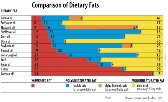 Fats are complicated and as you will see in teh table below each fat is made of a combinations of different fat categories.