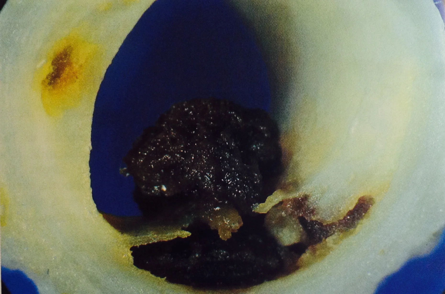 Cross-section of an artery around the heart muscle showing a ruptured plaque at the bottom of the picture. There is a blood clot inside the plaque extending up into the hallow lumen (tube) of the artery. The plaque usually ruptures because of inflammatory cells weakening the surface layer.