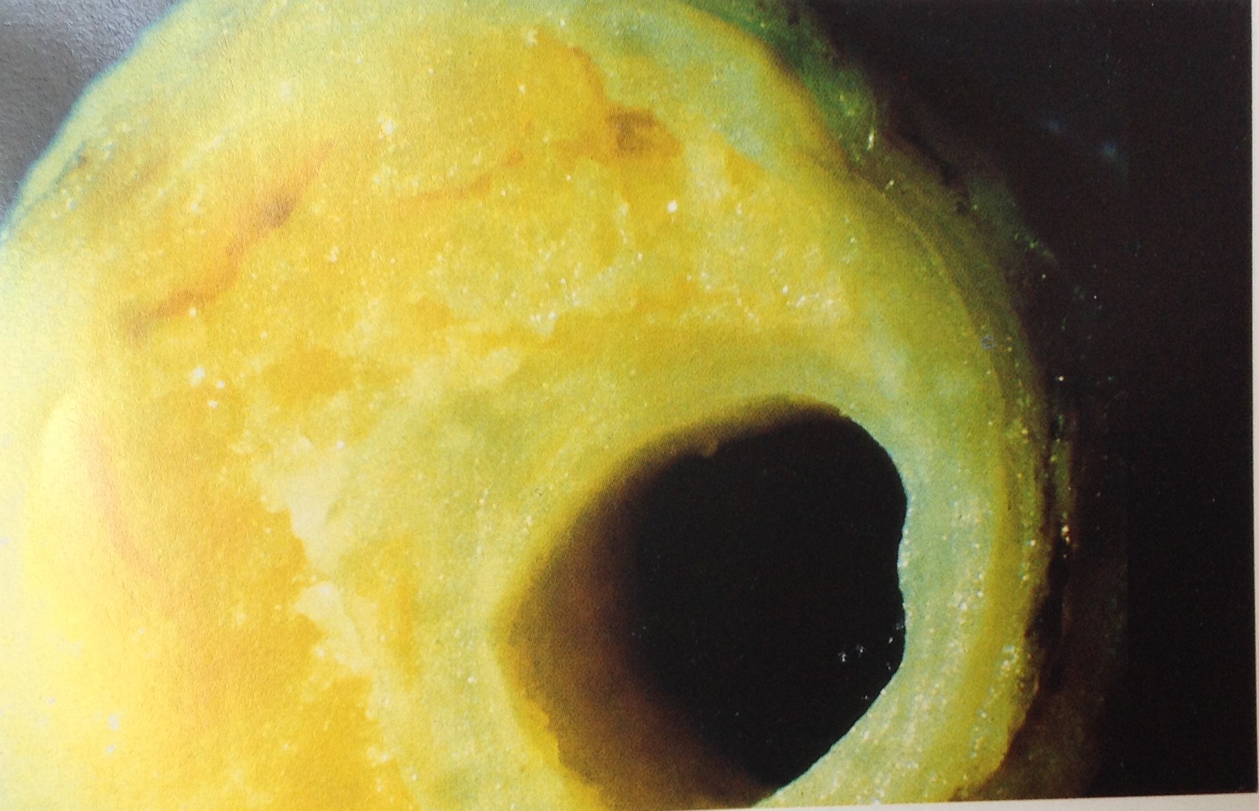 This is a cross section of an artery showing a large plaque to the left side of the picture. It is intact and the lumen clear. The plaque is made of lipids, surrounded by inflammatory cells called macrophages, which normally help us fight infection.