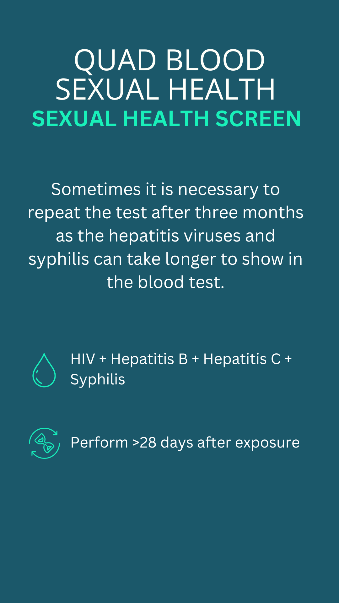Most tests can be done from 28 days onwards. But there is a chance of missing syphilis when tests are performed at day 28 ,as syphilis can take as long as three months to show in the blood. where tthere is any concern we would recommend repeating these blood tests for completeness.