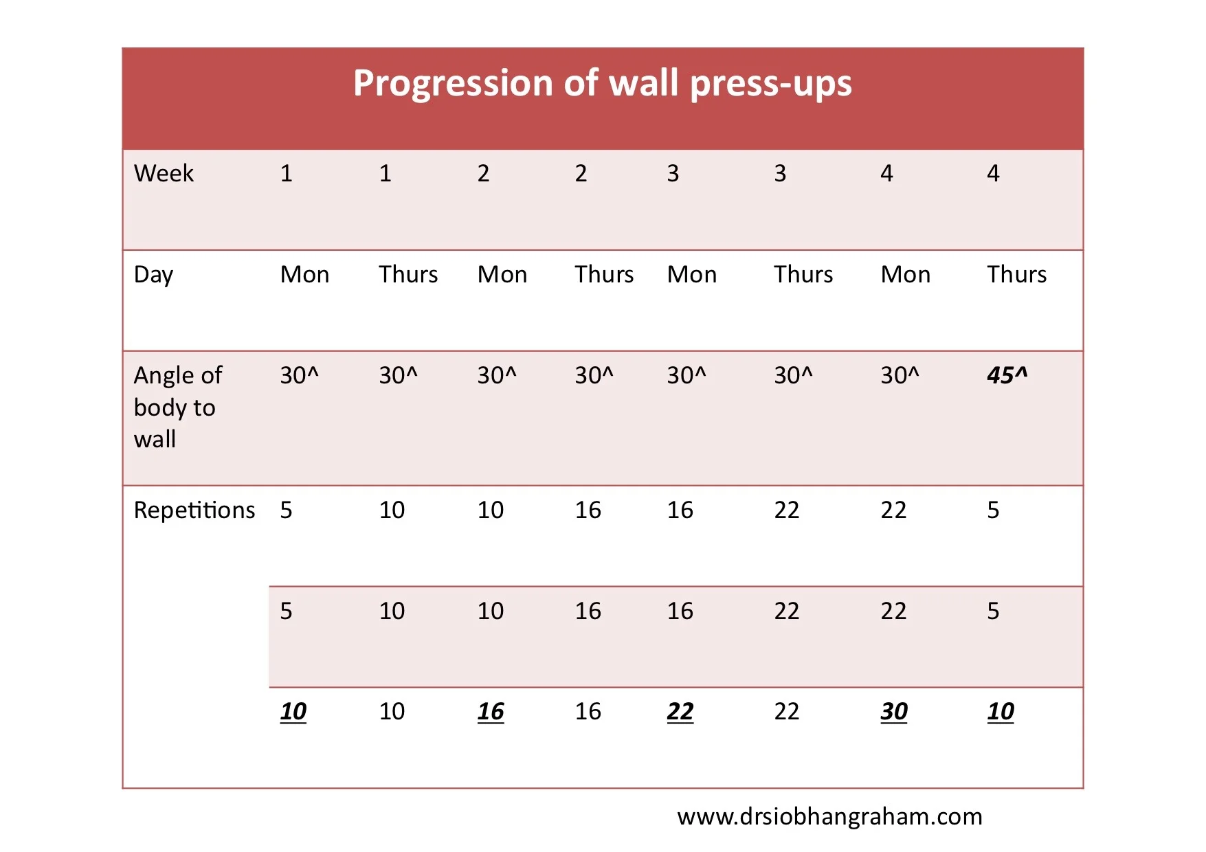 Table 2. Once you have exceeded 25 repetitions then increase the angle to the wall and start again with a low number of repetitions.
